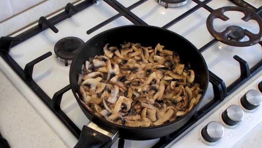 Грибы нарезать полукольцами, отправить их к луку и подвергать термической обработке до полного испарения жидкости, а потом посолить.