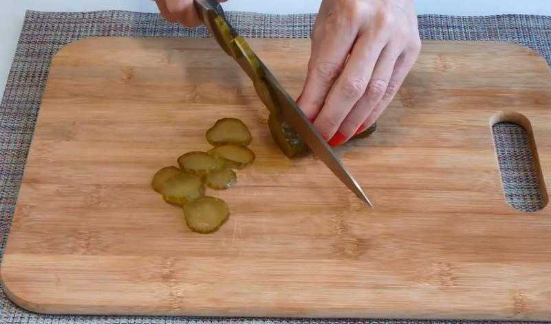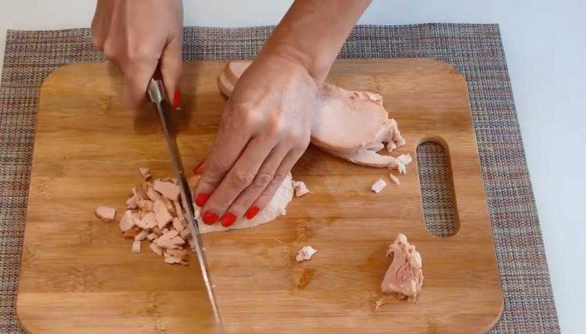 На заметку! Если вы отваривали грудку с кожицей, то перед нарезкой обязательно её нужно снять.