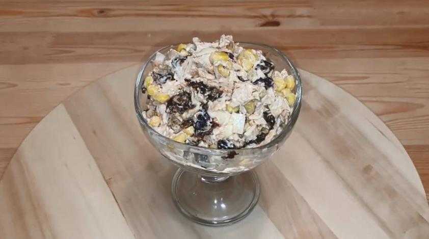 В этой необычной закуске копченая курятина отлично гармонирует с вкуснейшими сухофруктами. В нее добавляется чернослив, который делает все составляющие вкуснее. Легкий салат приготовить можно быстро, поэтому его ставят на стол, когда гости уже на пороге.