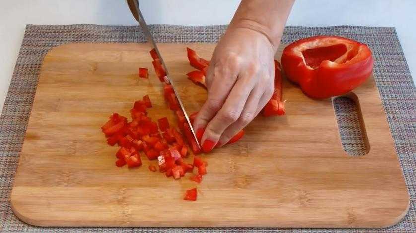 Вареные яйцо и морковь натереть на крупной терке. Перец избавить от плодоножек и семян, нарезать небольшими ломтиками.