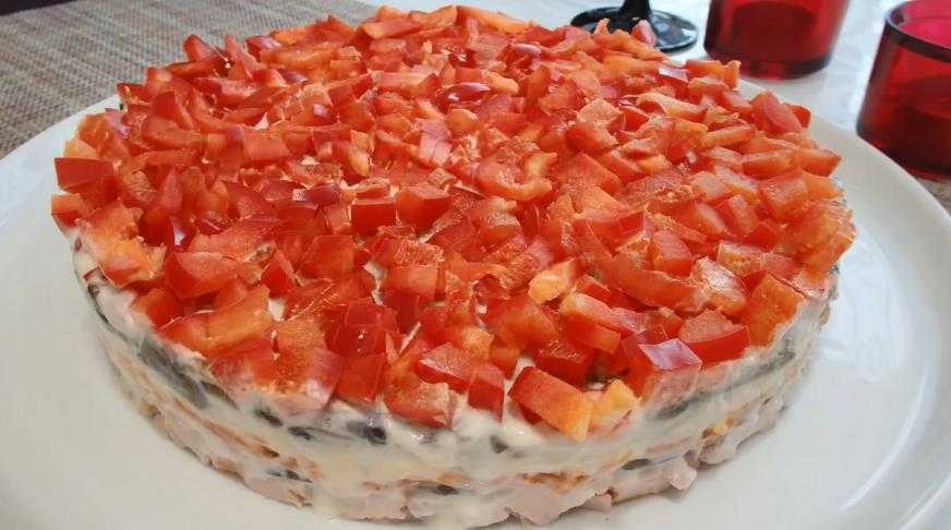 Слоеный салат с копченой курицей и грибами шампиньонами