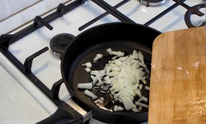 В сковороду наливаем 100 мл. растительного масла и высыпаем 1 головку лука для обжаривания на небольшом огне, доводя до золотистого цвета.