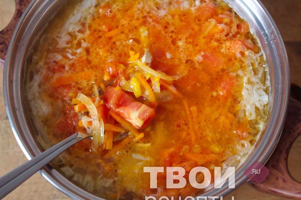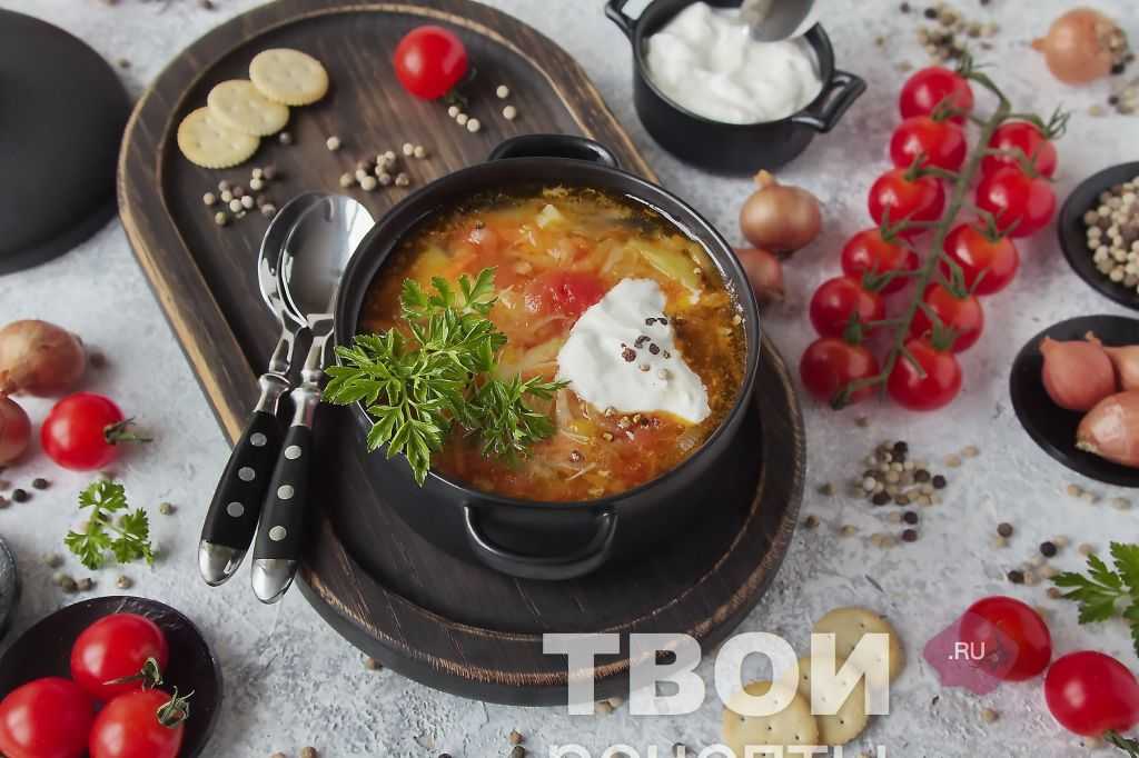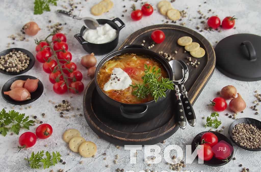 В этом рецепте щи готовятся с помидорами, капустой и болгарским перцем.