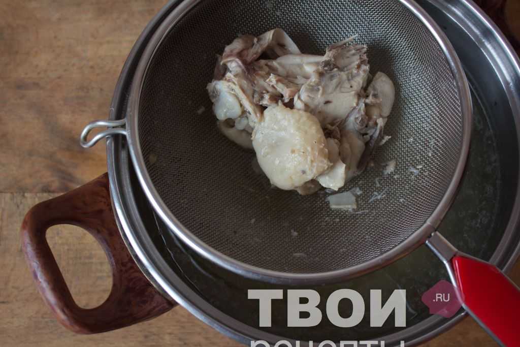 Куриный бульон процедить, бёдра разделать — кожу удалить, мякоть отделить от костей, отложить на время на отдельную тарелку.