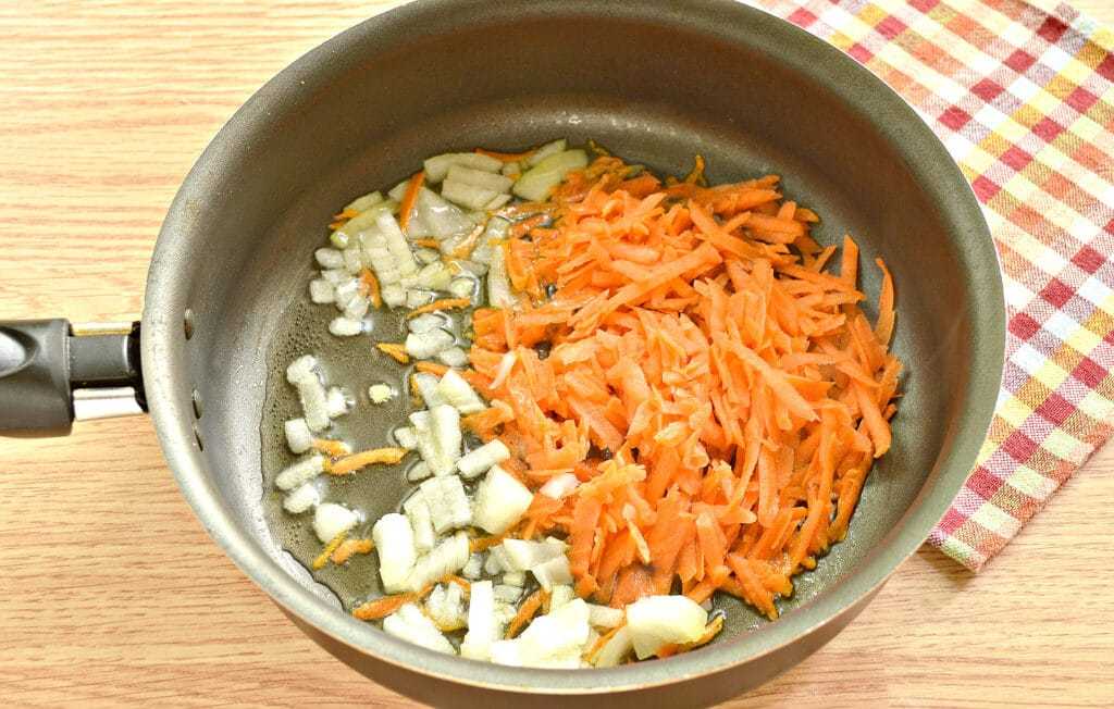 - Лук освободите от шелухи, нарубите кубиком, морковку – на терке, обжарьте на сковороде с жиром до румяного цвета.