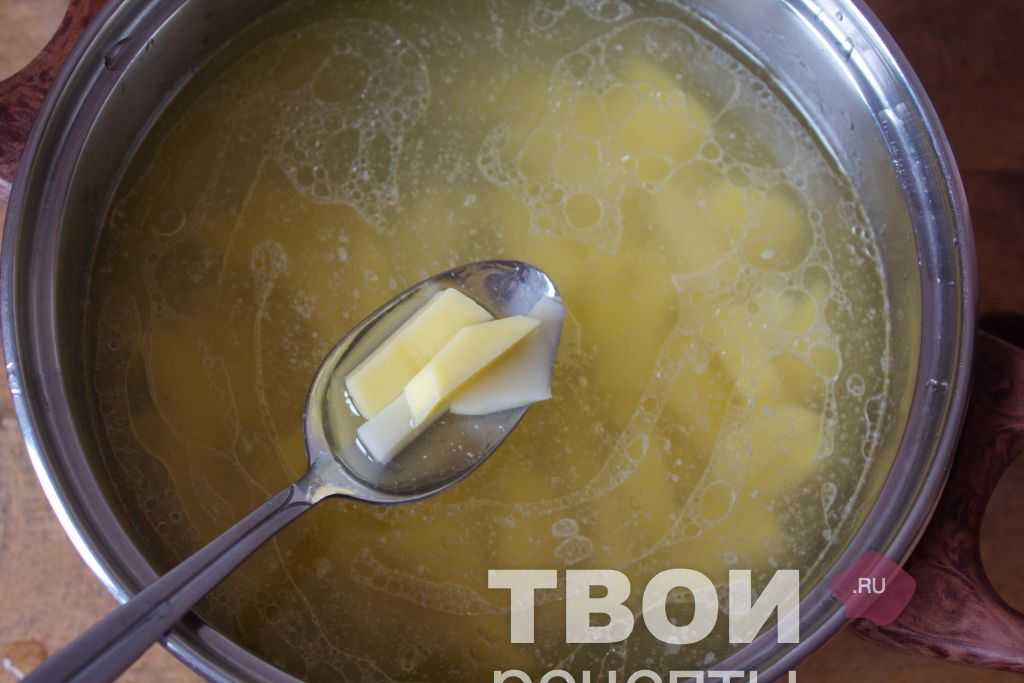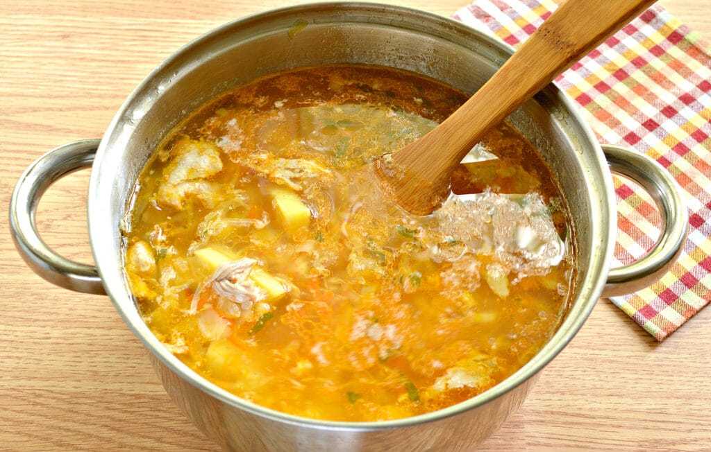 - Очищенный картофель нашинкуйте брусочками, выложите в бульон, поставьте на умеренный огонь и варите чуть меньше получаса.