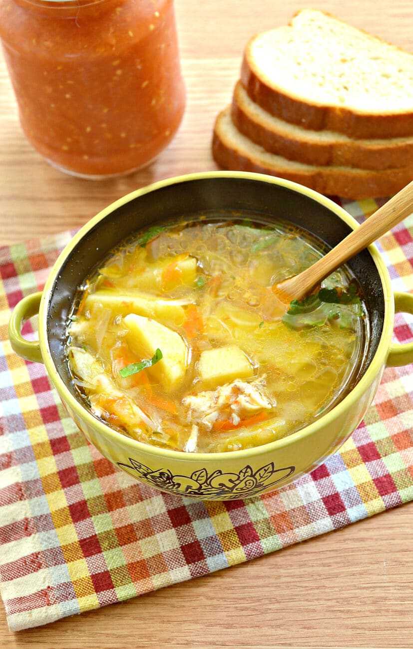 - Подавайте в глубоких тарелках со сметаной, по желанию положите небольшой кусочек куриного филе.