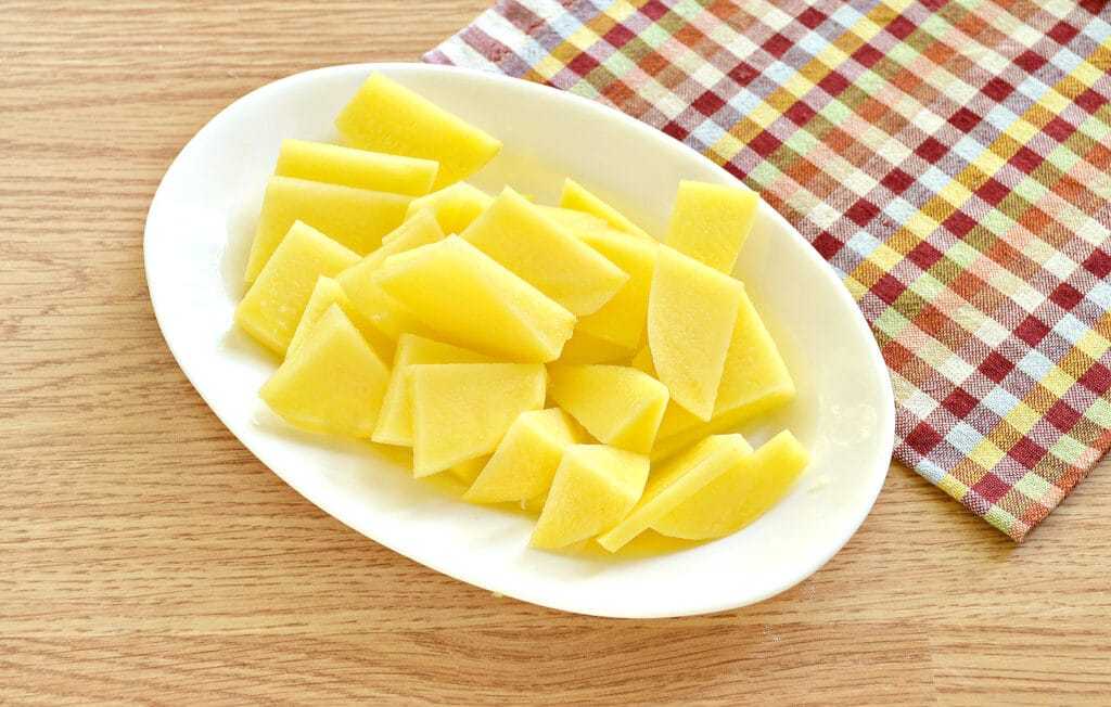 Картофель очистить и разделать брусочками среднего размера — опустить в кипящий бульон и готовить до состояния аль денте.