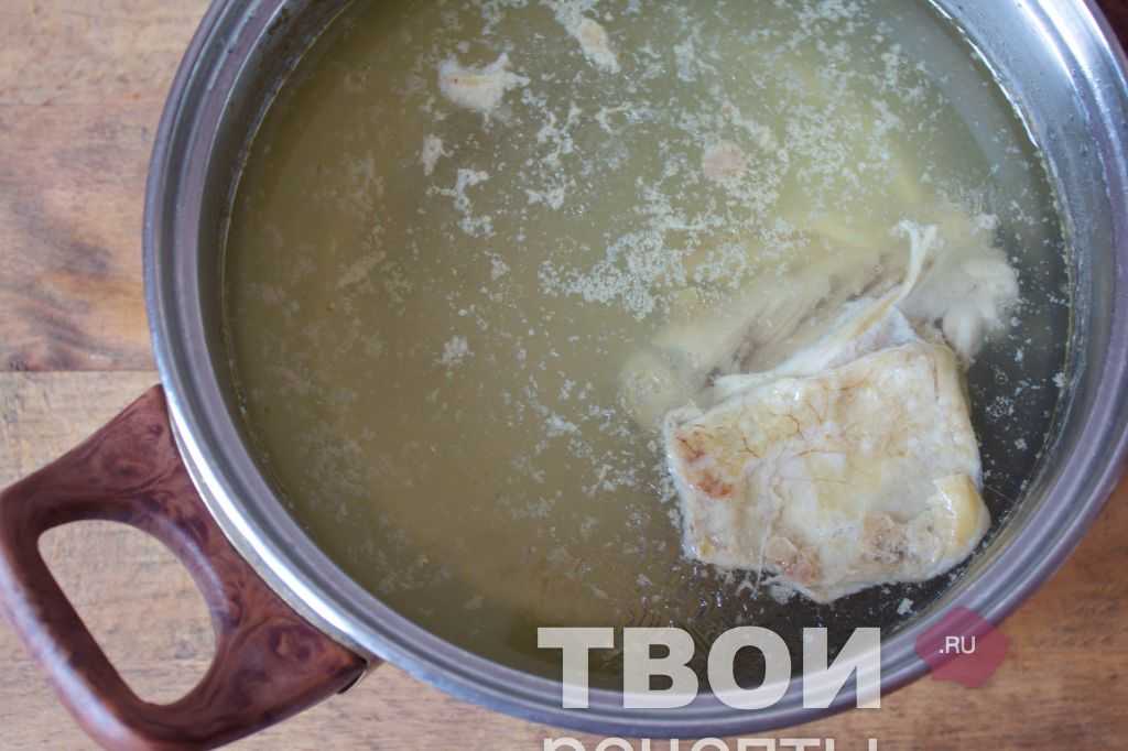 - Сварите бульон: помытые окорочка положите в глубокую емкость с тремя литрами воды. Бросьте лавровые листья, душистый перец, посолите и поставьте на плиту с большим пламенем огня, дождитесь закипания, снимите пенку. Убавьте огонь и проварите на медленном 45 минут. Окорочка выньте, бульон процедите.