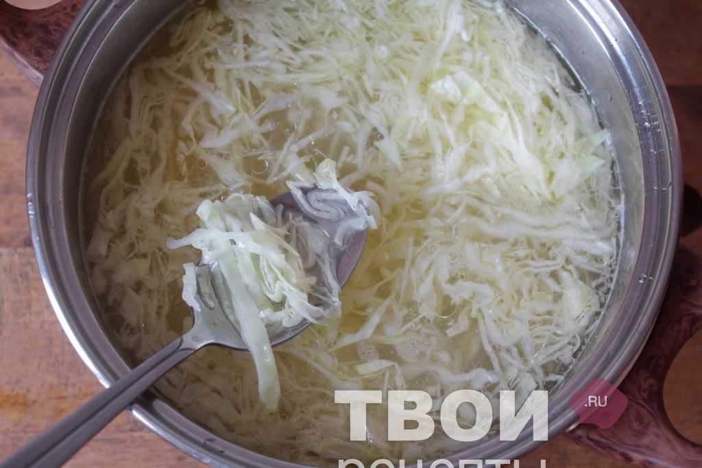 Свежую капусту нашинковать тонкой соломкой, добавить в бульон к картофелю — готовить на умеренной температуре до мягкости.