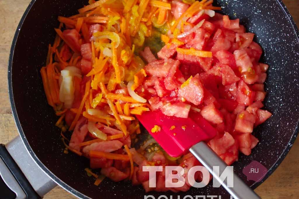 Лук нашинковать перьями, морковь и сладкий перец разделать соломкой — спассеровать овощи до прозрачности. С помидоров снять кожицу, порезать крупным кубиком — добавить к овощам и продолжать пассеровать, приправить овощи сахаром.