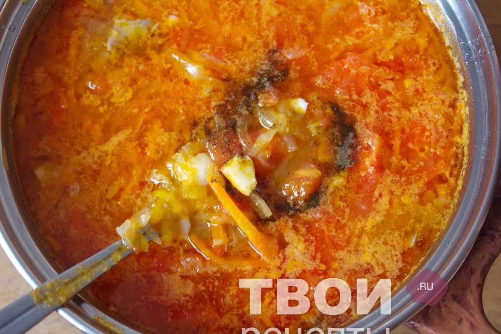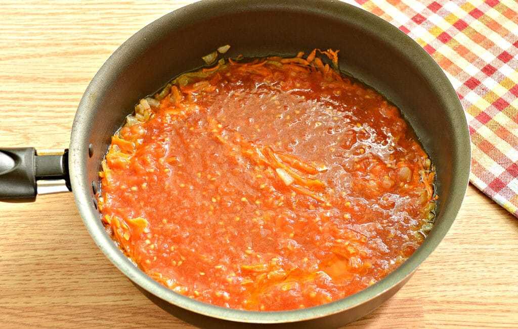 Заправить щи пассеровкой с помидорами, довести до кипения — температуру тут же убавить и готовить 12-15 минут.