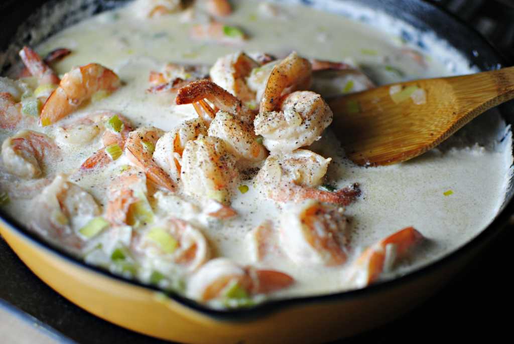 Состав компонентов: 170 мл жирных сливок, 270 г очищенных креветок, 70 г голубого сыра, 2-3 чесночные дольки, по 1 большой ложке масла оливы и сливочного, поваренная соль.