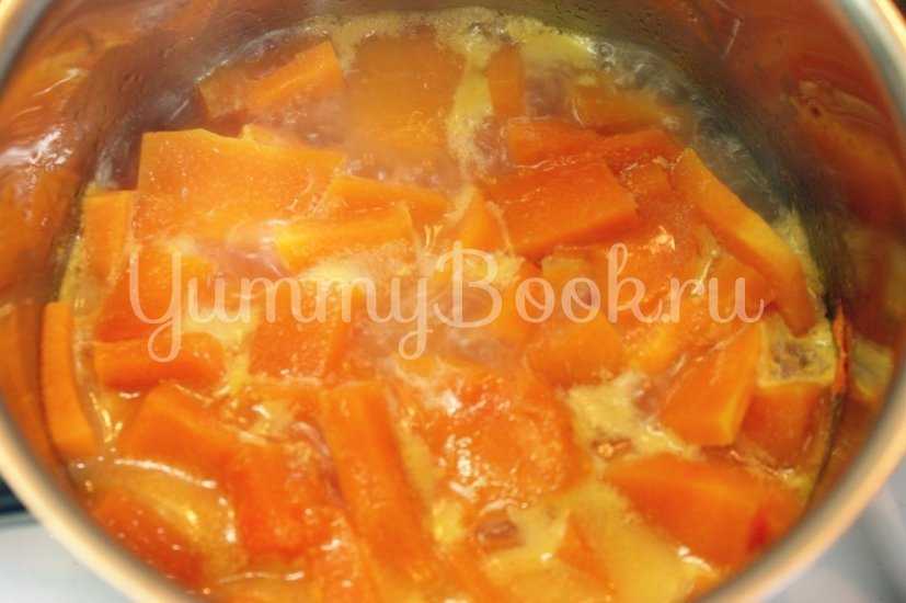 1. Тыкву очистить от кожуры, нарезать небольшими кусочками, залить водой, добавить масло и тушить до мягкости. Остудить.