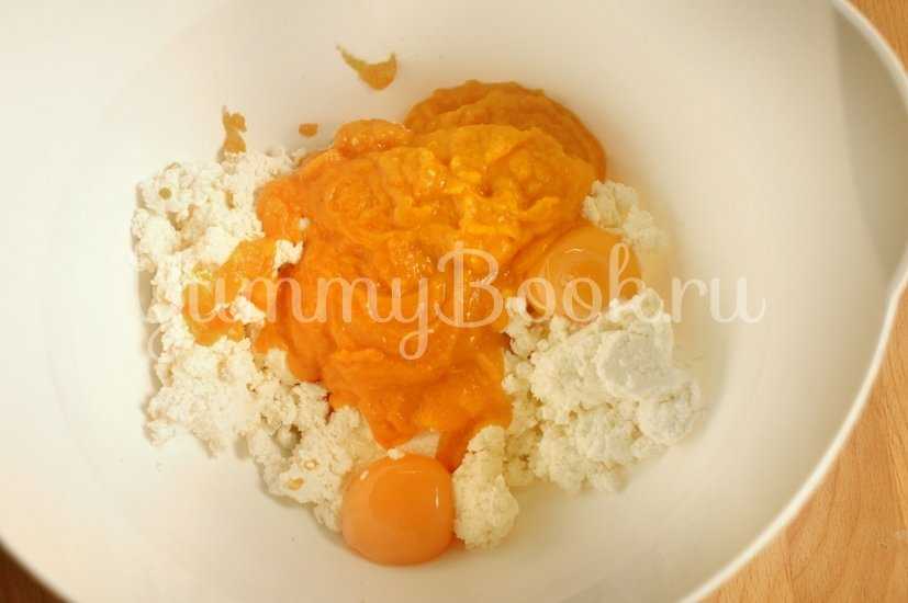 4. Яичные желтки отделить от белков. В миску к творогу добавить тыквенное пюре, желтки.