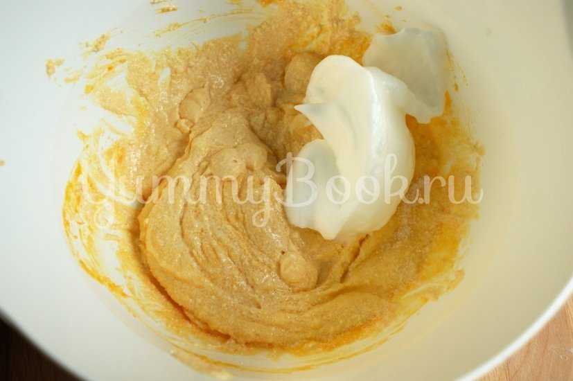 9. Белки взбиваем отдельно в крутую пену. Вводим их в тыквенную массу и аккуратно перемешиваем венчиком снизу вверх.
