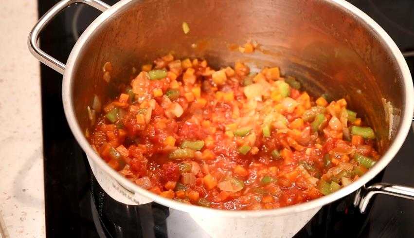 Морковь и сельдерей нарезать кубиками аналогичными остальным овощам. Обжарить с остальными компонентами, пока они не станут мягкими, залить томатами.