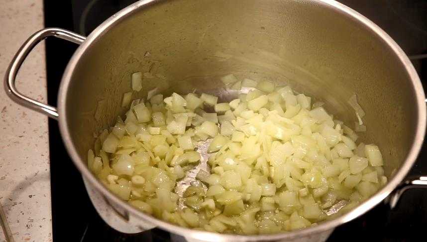 Трёхлитровую металлическую кастрюлю поставить на средний огонь, влить в неё растительное масло, добавить лук и в течение 1 минуты, помешивая довести его до прозрачности. Затем добавить морковь, перемешать, продолжить обжаривание 1 минуту.