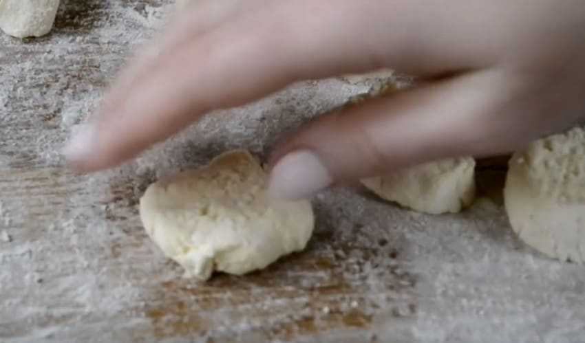 - Из приготовленного теста слепите руками, смоченными водой, небольшие шарики (как грецкий орех) и придайте им вид лепешек.