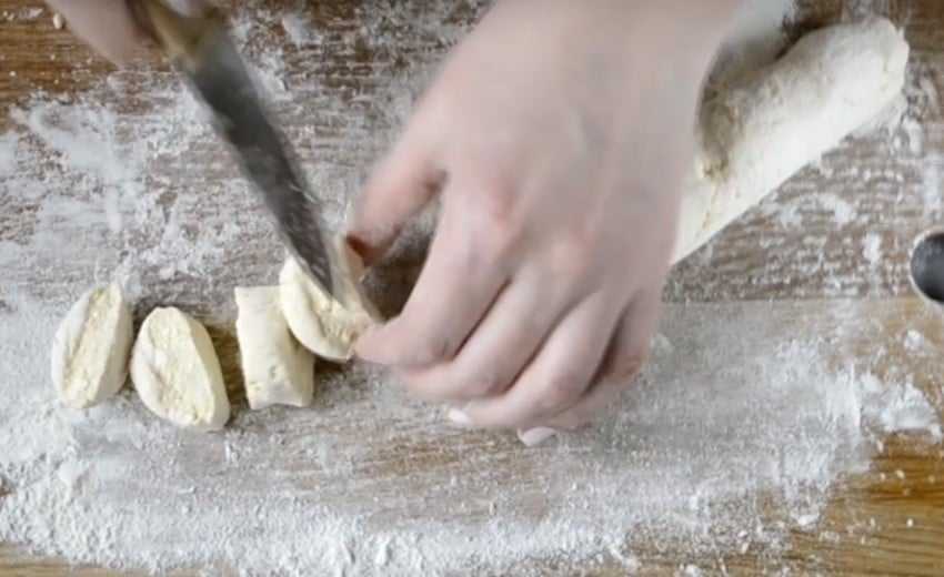 - После нарезаем все кусочками, примерно по одному сантиметру и делаем из них лепешки.
