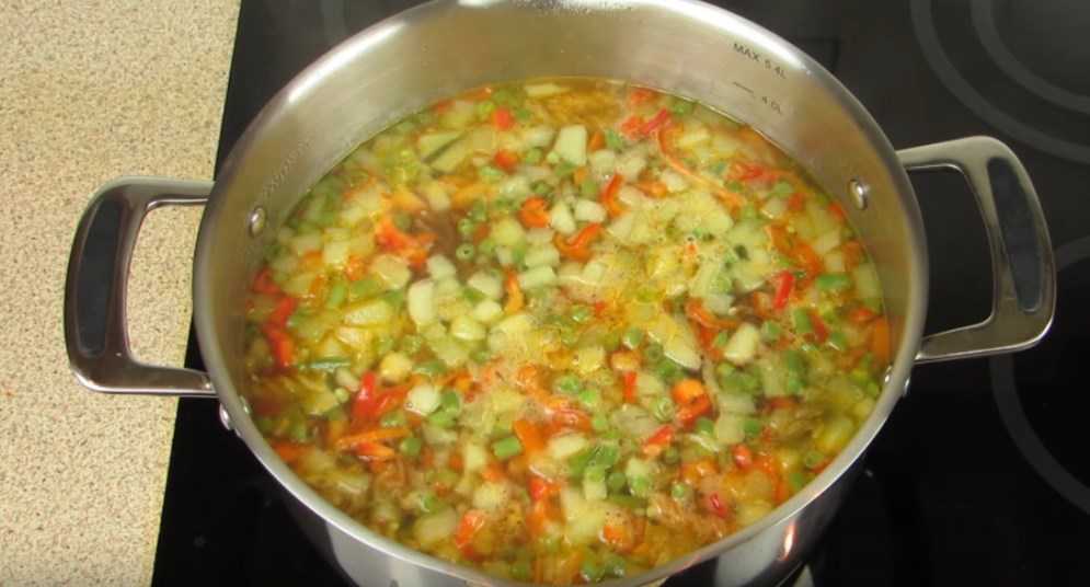 7. Далее налейте кипяченую горячую воду или бульон, дайте овощам повариться в течение 5 минут.