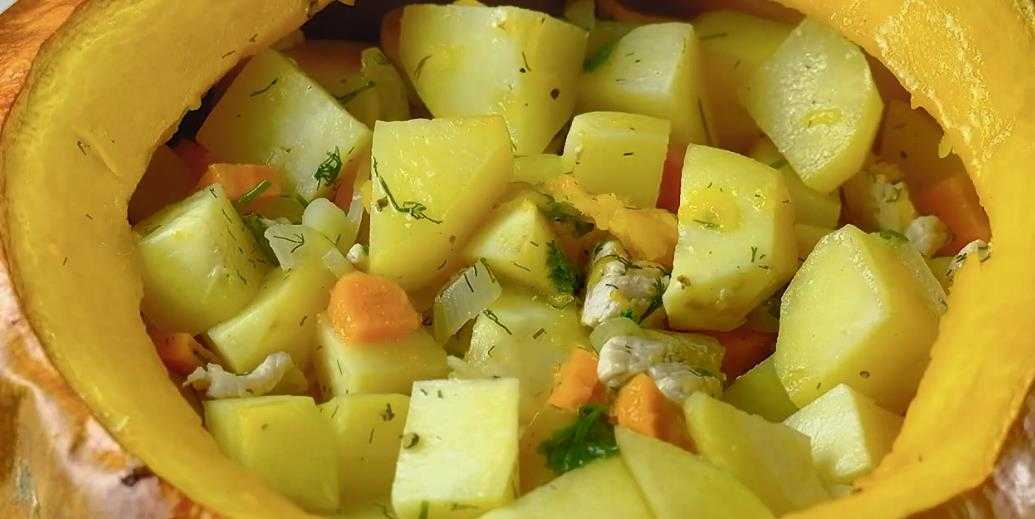 Тыква, начинённая мясным фаршем и картофелем, одно из самых сытных блюд. Благодаря оригинальной форме его можно готовить как горячее блюдо на праздник. Секрет популярности такой запеканки — тыква ускоряет переваривание тяжёлой мясной пищи и впитывает мясной бульон, становясь очень нежной и аппетитной.