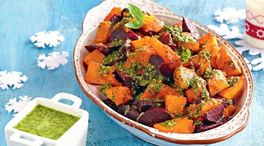 Перед подачей смешайте тыкву и свеклу в керамической форме (в ней вы подадите овощи на стол), сбрызните маслом и прогрейте в разогретой духовке. Подавайте с песто.