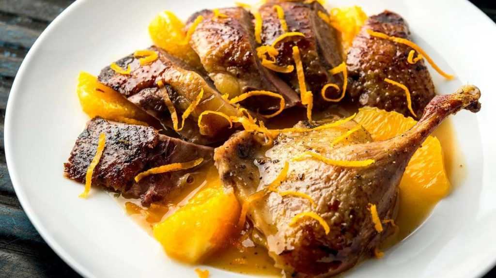 Тушеная утка в апельсиновом соусе с цедрой и апельсиновым ликером. Прекрасная горячая закуска — очень вкусная и ароматная.
