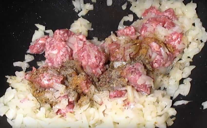 В сковороду к луку добавить мясной фарш и все тщательно перемешать. Затем в полученную смесь необходимо всыпать соль и перец.