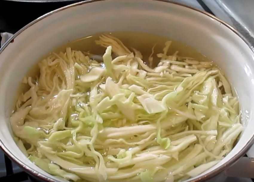 В кипящую воду закинуть нашинкованную капусту, варить в течение пяти минут. После чего капусту нужно выложить в дуршлаг и подержать под холодной водой. Таким образом капуста станет немного крепче после варки.