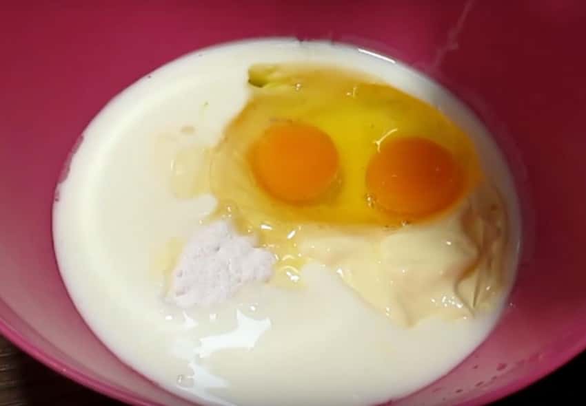 5.Для приготовления теста просто смешайте все продукты из списка в однородную смесь: яйца, кефир, майонез, соль, соду и муку. Можно это сделать миксером для ускорения.