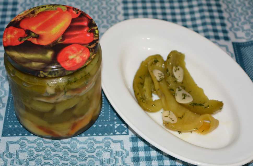Вымытый и очищенный от семян перец сладкий жарят на сильном огне 3-5 минут, затем укладывают в банку, поливая каждый слой приготовленным маринадом из соли, сахара и уксуса. На плотно выложенный в банку овощ кладут 3-4 веточки укропа. Он сохраняет вкус овоща и его полезные витамины группы В, РР и С. Банку закатывают. Открыв зимой баночку такого лакомства, можно приготовить массу различных блюд: перец, фаршированный мясом или овощами, канапе с черным хлебом, соус с сыром для макарон, «мешочки» с рисом и овощами и многие другие блюда.