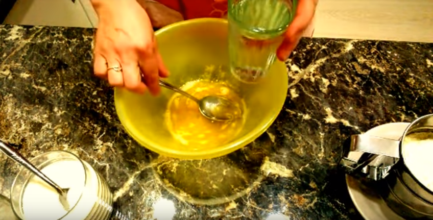 1.Берем стакан теплой воды и отливаем с него 1/3 часть в другую посуду. К отлитой воде, добавляем мед, перемешиваем пока он растворится, а затем кладем сухие дрожжи, размешиваем и оставляем для брожения.