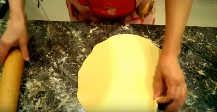Вооружаемся скалкой и раскатываем тесто в тонкий круглый пласт (вторую часть можно убрать на хранение в морозильную камеру либо также использовать сразу).