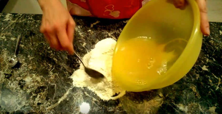 Сформировать из муки с манкой горку, сделать углубление в центре и осторожно, в несколько этапов, вылить в него теплую воду. Смешивать муку с водой следует очень аккуратно при помощи вилки, стараясь, чтобы вода не вышла за края углубления