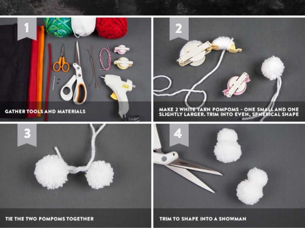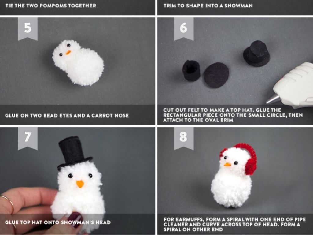 Из белых ниток делаем 2 помпона, оставляя у каждого по кончику 7-8 см. Концы завязываем и обрезаем лишние «хвосты».