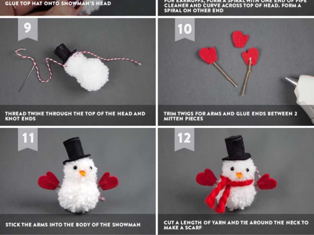 Для украшения подарка пригодится вот такой симпатичный снеговик из помпонов. Он крепится скотчем к обёрточной бумаге. Кроме того, его можно и на ёлку повесить.