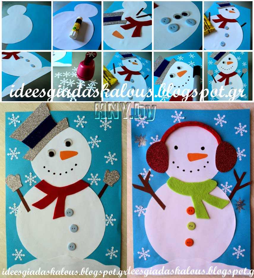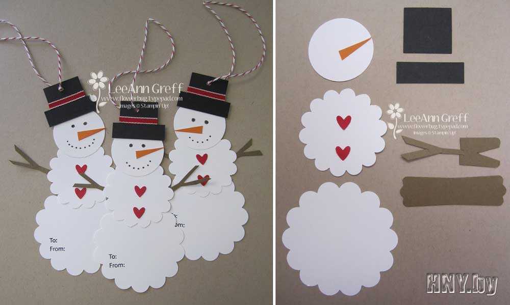 А вот поделка снеговика, которого можно повесить на елку в качестве игрушки или использовать как бирку для подарка, с указанием кому предназначен подарок и от кого.