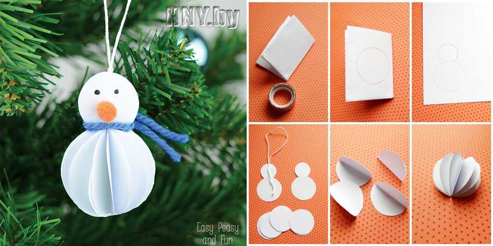 А вот снеговичок с объемным брюшком. Нарисуйте заготовку тела снеговика и дополнительно вырежьте несколько кружков по размеру с нижней частью снеговика. Кружочки согните пополам и склейте между собой, а затем приклейте к заготовке. Объемный снеговик га елку своими руками готов!