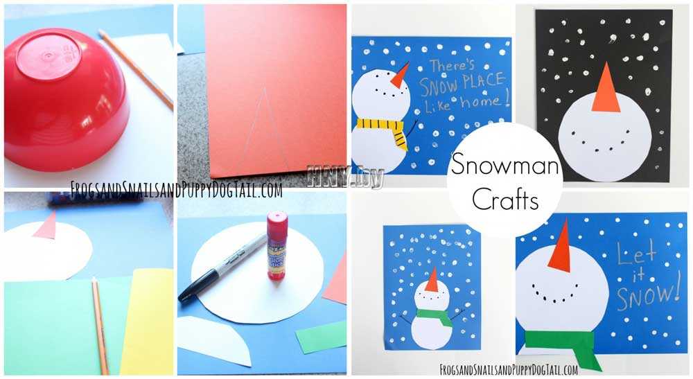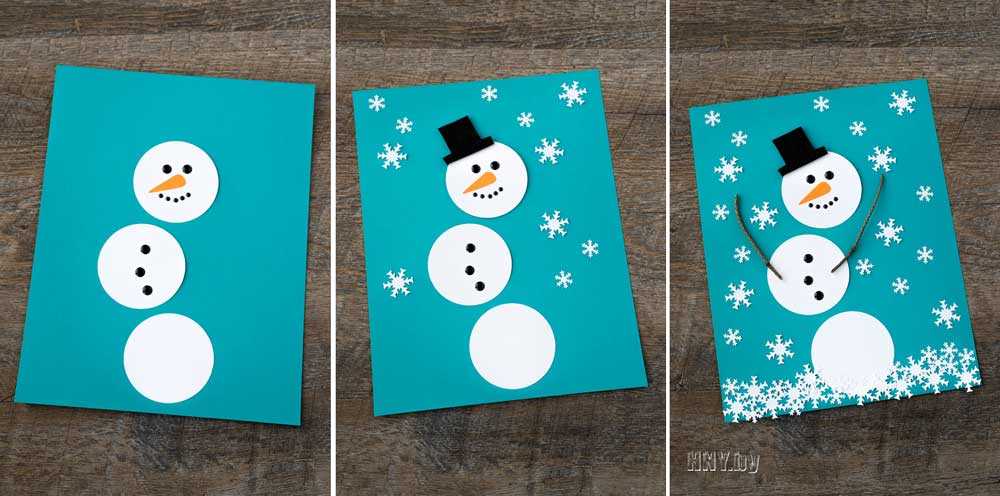 Простые в исполнении поделки снеговиков — в технике аппликация. Вам понадобится белая бумага, клей и немного фантазии. Самый простой вариант — три кружочка, приклеенные на лист цветной или раскрашенной бумаги для контраста. Декорировать дополнительно поделку можно блесками, пайетками, наклейками и пр.
