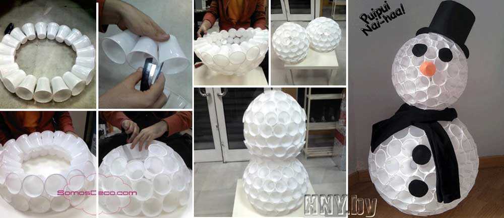 Сделать снеговика своими руками можно и из пластиковых стаканчиков. Статуя получается огромная и лучше подойдет для уличного декора. Так что если снега нет, собирайте ребятню со двора и делайте всем двором снеговика без снега! Снег-снегом, а праздничное настроение должно быть не смотря ни на что!