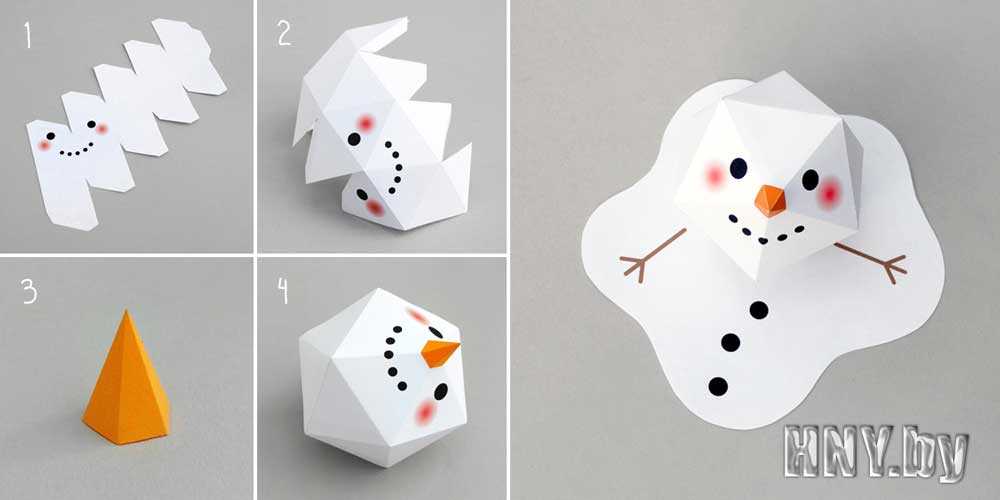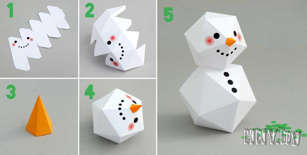 Из бумаги также можно сделать и объемных снеговиков. Вот, например, объемный геометрический снеговик, которого Вы с легкостью изготовите, воспользовавшись готовыми шаблонами, скачать которые можно под картинкой. Как складывать заготовку подробно описано в МК на картинке.