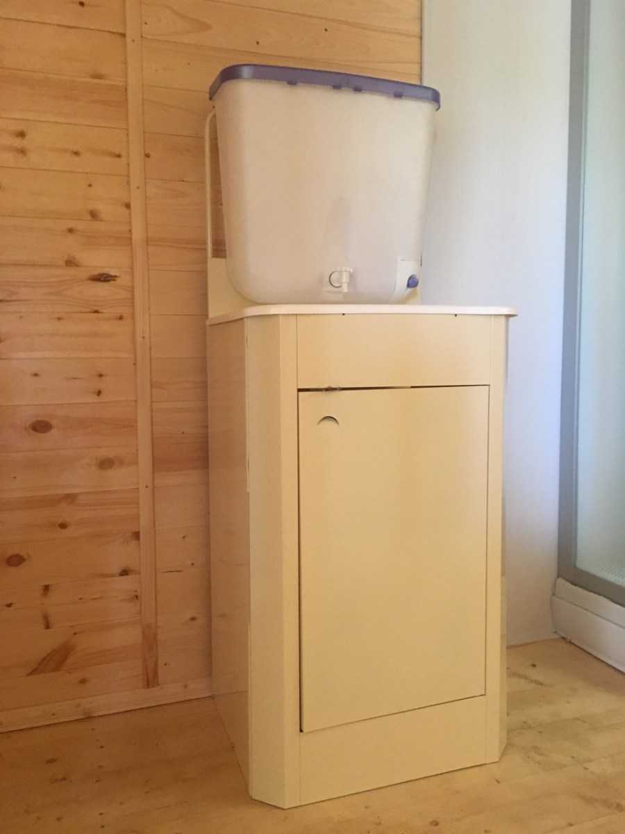 - подвесной умывальник — можно приобрести готовый, но проще сделать из ненужного контейнера или даже бочонка;