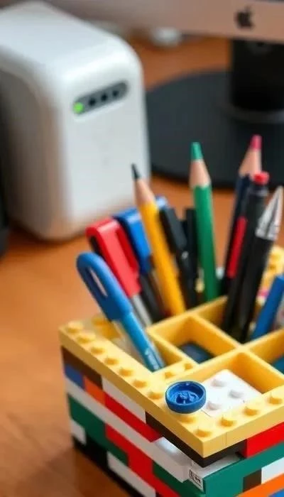 - Подставка для карандашей: Постройте цилиндрическую конструкцию из деталей Лего, достаточно широкую, чтобы вместить карандаши и ручки.