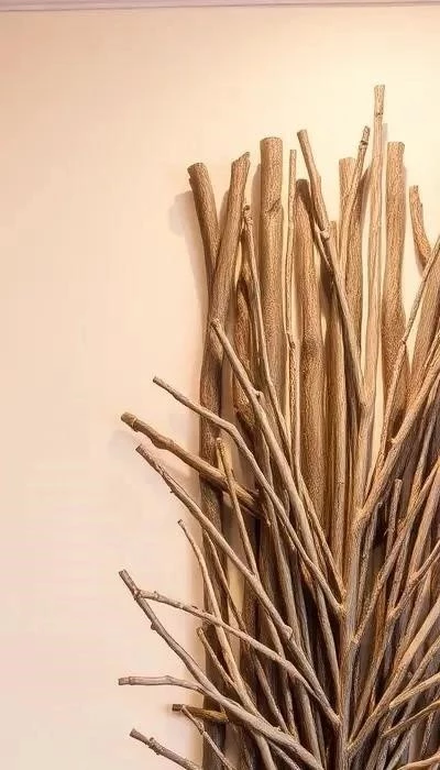 2. Декор стен: Панно из веток (Сложность: средняя, Стоимость: 500-1000 руб., Время: 2-3 часа). Соберите ветки одинаковой длины и закрепите их на деревянной основе с помощью клея или веревки. Украсьте панно мхом, цветами, бусинами или другими декоративными элементами.