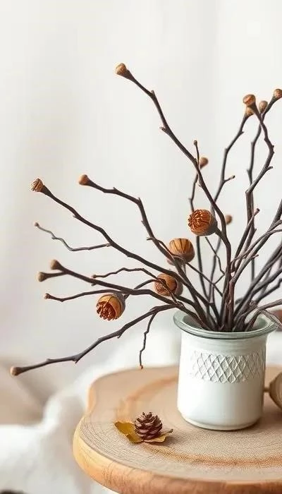 Рустикальный шарм: Выбирайте керамическую вазу с грубой текстурой и ветки с корой. Дополните композицию шишками, желудями и мхом. Прекрасно впишется в интерьер в стиле кантри или прованс.
