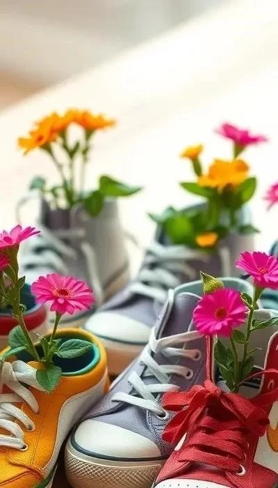 Декор цветочных горшков из кроссовок – это простой и эффектный способ дать вторую жизнь старой обуви. Вырезается верхняя часть кроссовка, создавая углубление для земли и растения. Можно покрасить кроссовок в яркие цвета или украсить его росписью. Уровень сложности – легкий, бюджет – эконом.