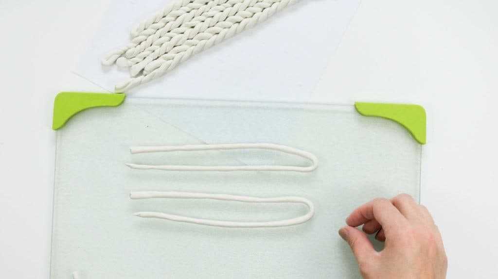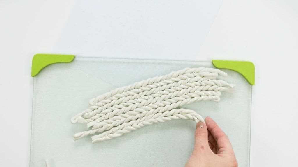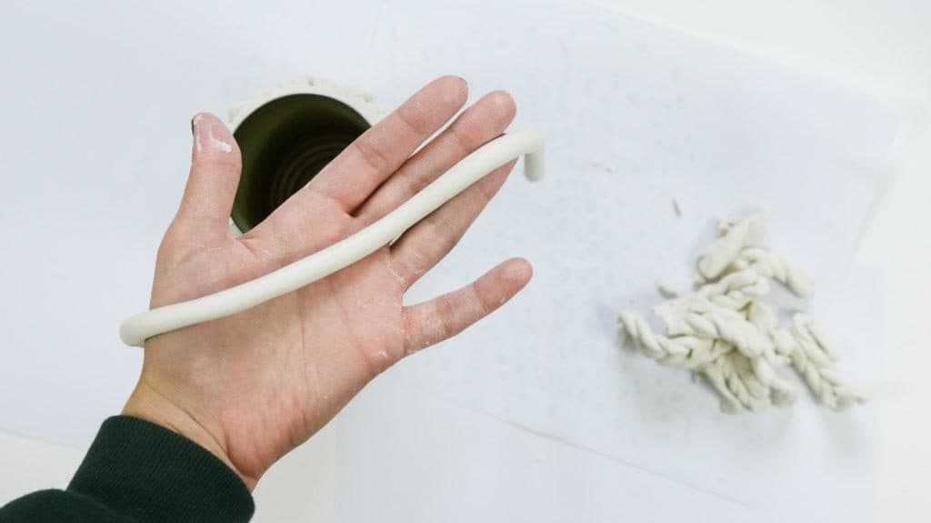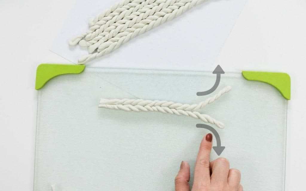 Каждый кусок глины следует взять и раскатать его руками. Должны получиться ровные пряди. Сначала скручивается две линии, а затем их нужно скрутить в противоположном направлении.