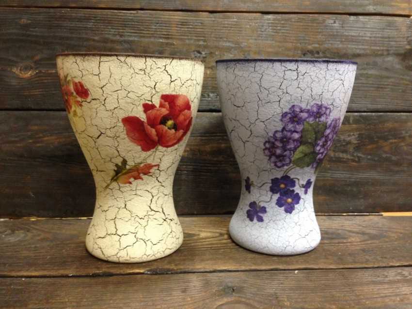 Эта техника декупажа вазы салфетками может из абсолютно невзрачного предмета сделать настоящий шедевр. Винтажный вид таким изделиям придает специальный лак, который наносится между слоями невысохшей краски.