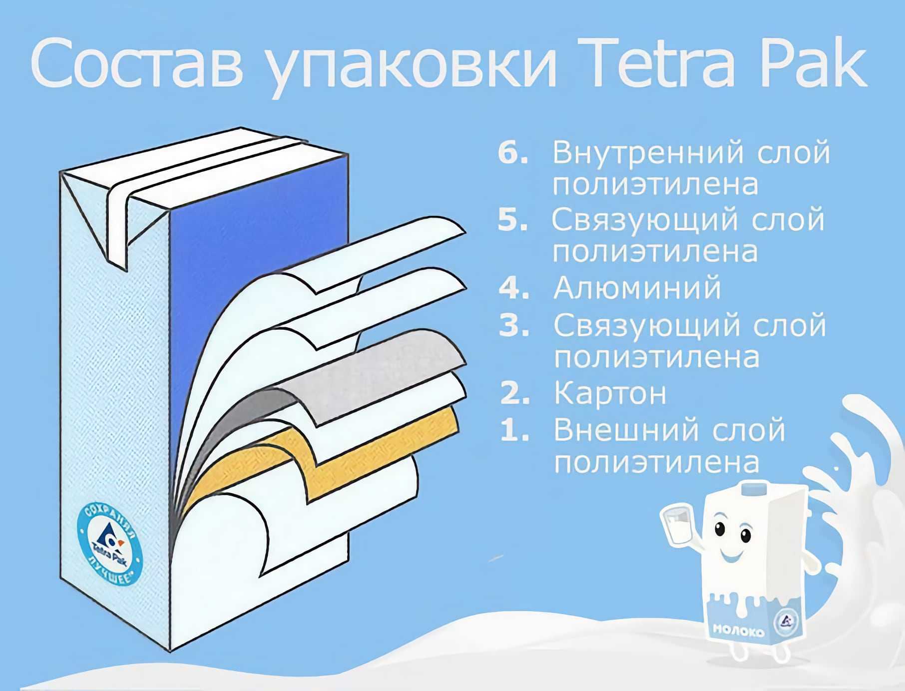 Полиэтилен защищает упаковку от влажности и склеивает картон и алюминиевую фольгу. Последняя не пропускает кислород и свет, что помогает сохранить свежесть продукта без охлаждения.
